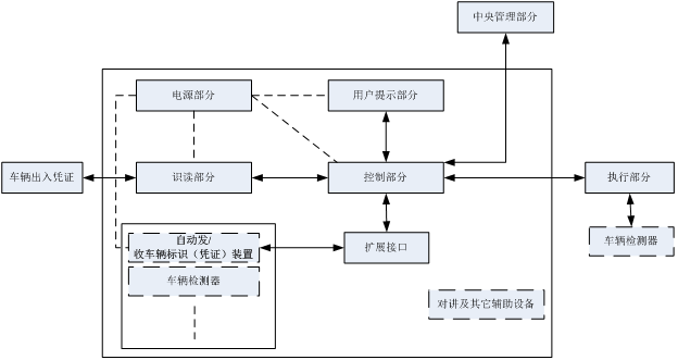停車庫(場)出入口控制設備一般由識讀部分、控制部分、用戶提示部分、電源部分等組成,可根據(jù)安全防范管理的需要擴充自動發(fā)/收車輛標識裝置、對講系統(tǒng)等,控制部分應能連接停車庫(場)出入口控制系統(tǒng)的中央管理部分、執(zhí)行部分,結(jié)構(gòu)及組成如圖1所示: